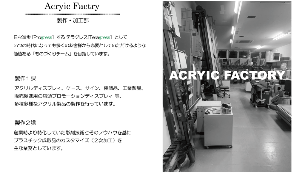 日々進歩 [Progress]する テラグレス[Teragress]としていつの時代になっても多くのお客様から必要としていただけるような価値ある「ものづくりチーム」を目指しています。